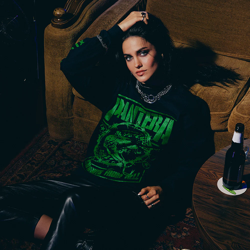 The black long sleeve front print includes a Pantera logo, snake and Cowboys From Hell, printed in green. A CFH and a Pantera logo on the back, and the right sleeve print includes, a CFH logo. ARL TX and a snake, also printed in green.