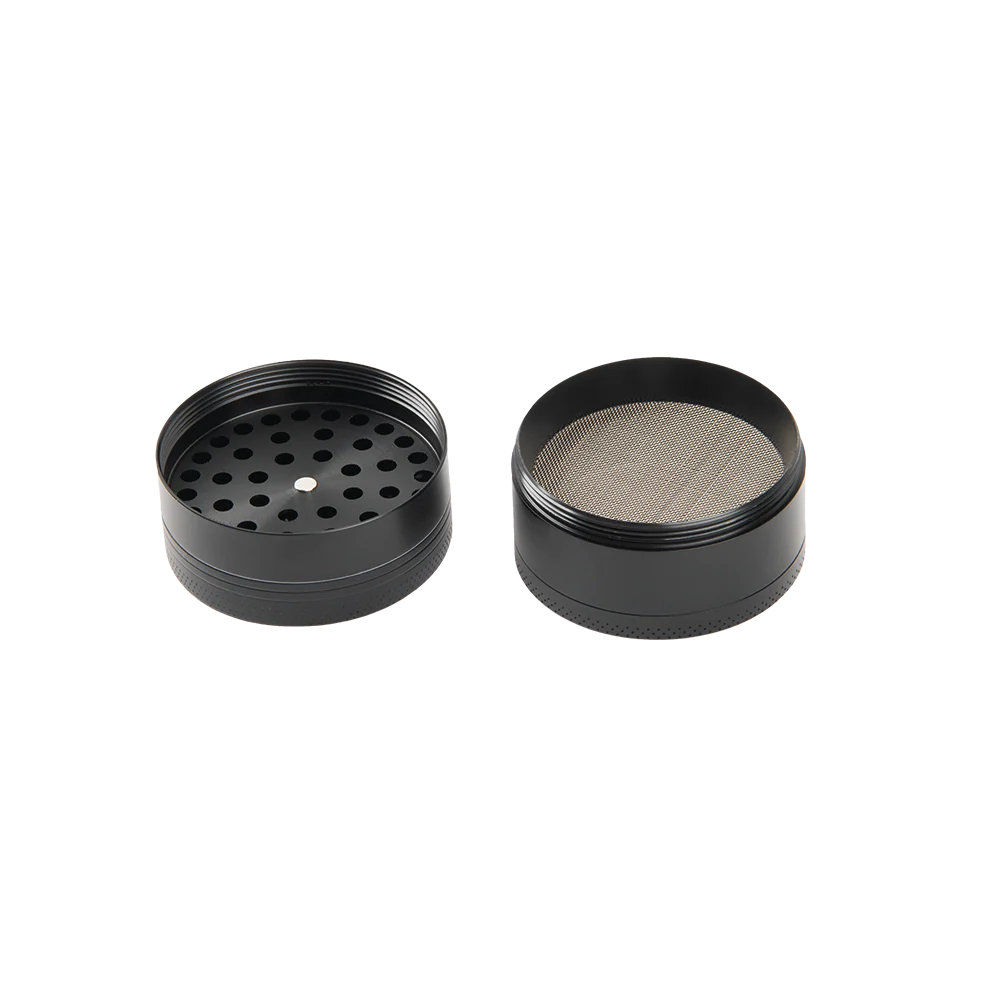 Black Grinder Featuring Pantera Logo And Skull Smoking Cannabis Illustration.